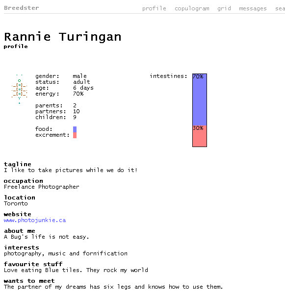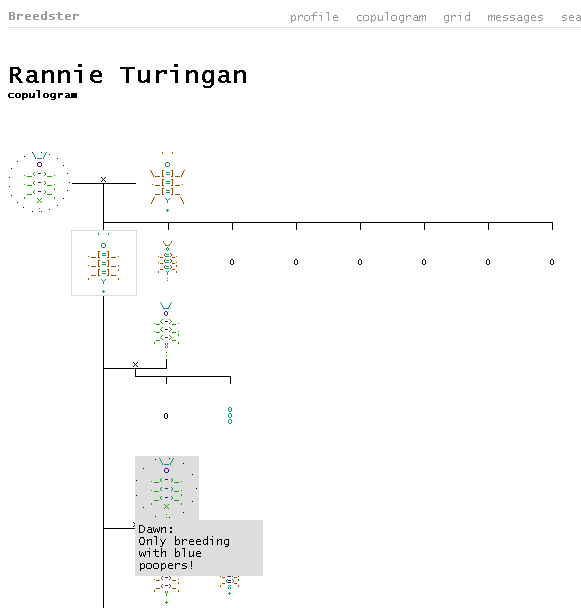 Breedster is an online community website designed for friends. The main goal of our service is to make your social life, and that of your friends, more active and stimulating. Breedster's social network can help you both enrich existing relationships and establish new ones by reaching out to people you've never met before. Who you interact with is entirely up to you. Breedster makes it easy to find new people who share your interests or look for romantic connections. While standard social software often leads the usual in-crowd of friends you already know, Breedster has natural rules to prevent inbreeding. Just walk though our virtual space called the Grid™ and you will meet new people in your digital neighbourhood. Breedster organizes all your acquintances in the cutting edge Copulogram®. It doesn't just show your personal network, it gives an accurate depiction of all your relations.